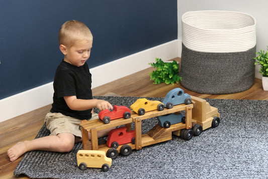 Wooden Car-Transporter Semi Truck and Trailer Toy Set with 6 Cars