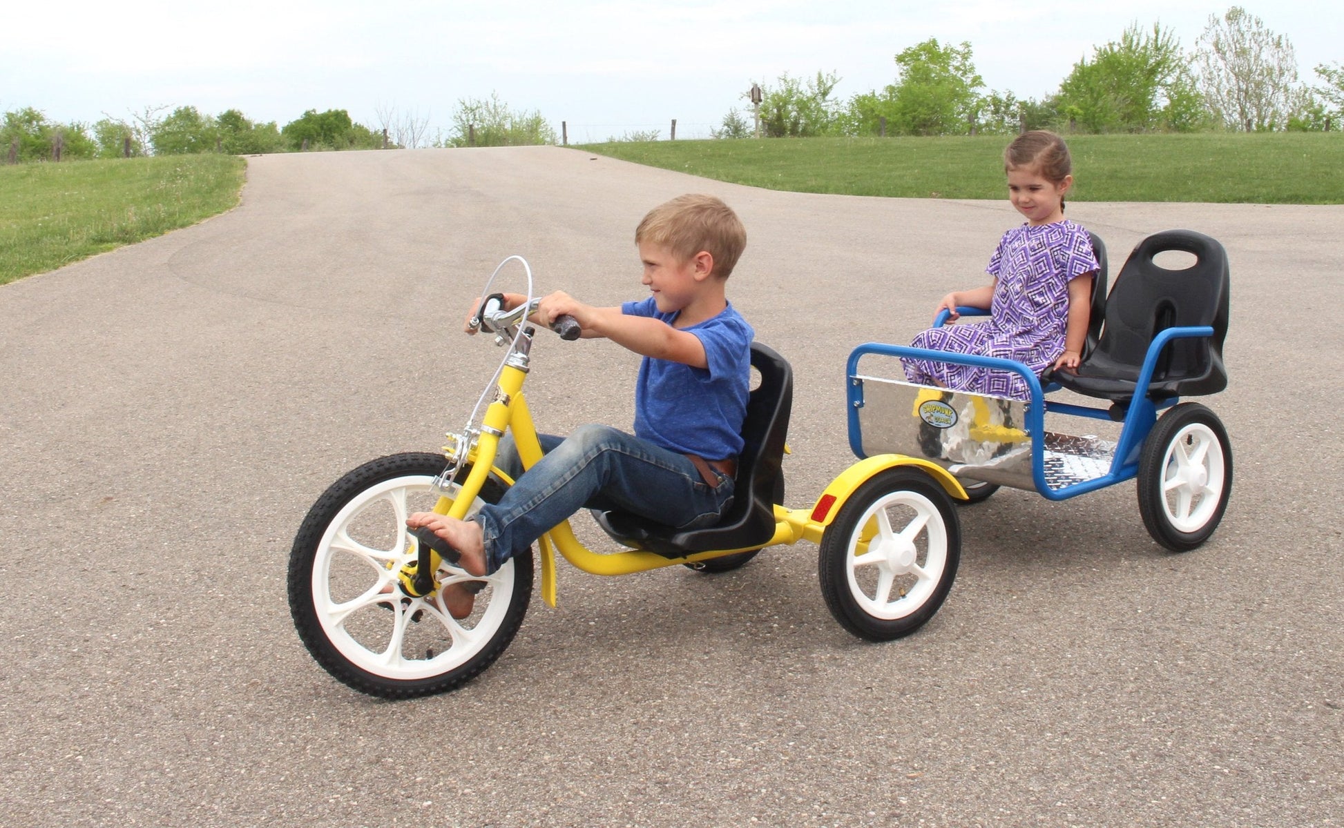 Amish-made "Chipmunk Coach" deluxe pull-behind trailer. Give your kids the ride of a lifetime with this unique pull-behind trailer. It is perfect for pulling behind a lawn tractor or ATV to give your kids the ultimate riding experience. It also pairs great with our Chopper Trike. It has a rear hitch to make a 'train' and give multiple rides at the same time. Features comfortable seats and easy-entry. The Chipmunk Coach is made by our Amish friends in Lancaster County, PA. Each seat measures 12" wide by 7" deep. The leg room area measures 12" from the front of the seats to the front of the coach. The overall measurements are 32" L x 24" W x 25" H. Powder-coated finish. Minor assembly is required.