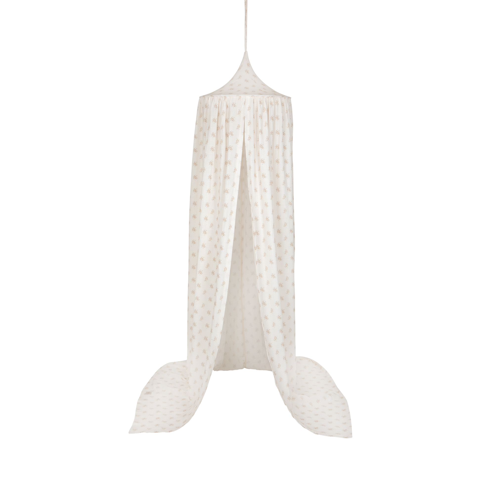 This canopy is made of soft white floral muslin fabric. With its convenient straps, it is a breeze to remove and wash. Extra straps inside the canopy also allow for you to hang an ornament or light inside.