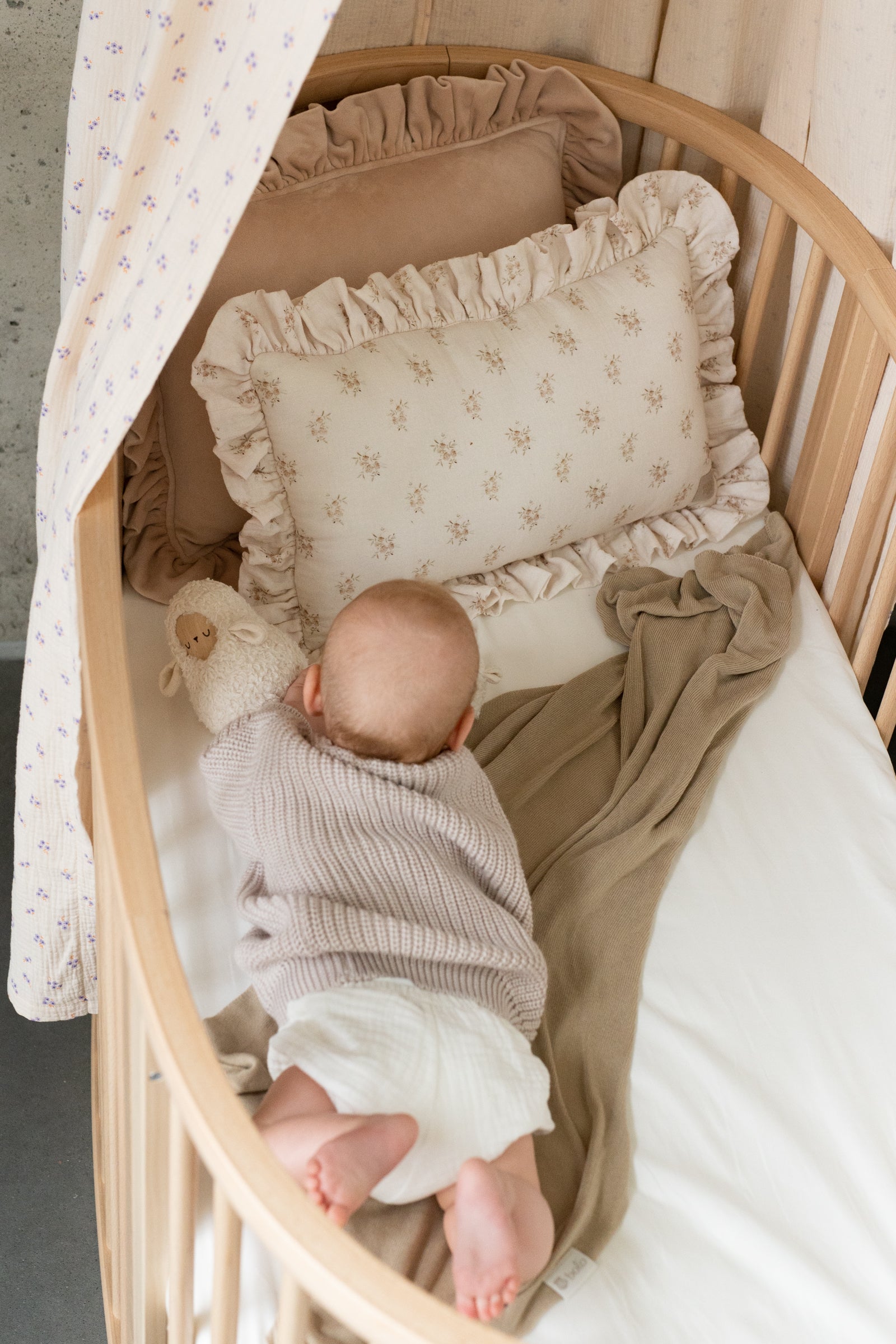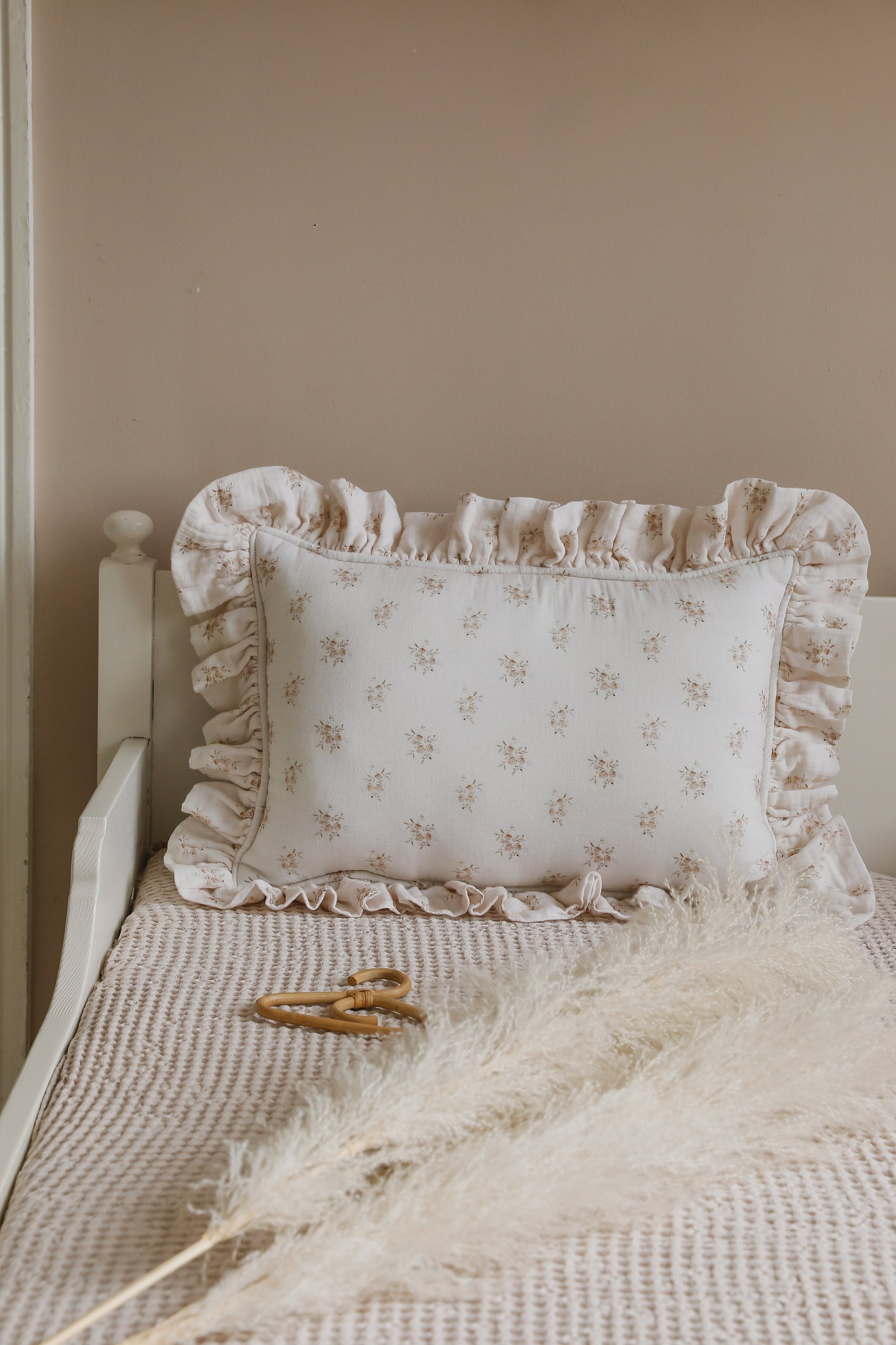 This soft-to-touch pillow, with a fancy frill, is carefully sewn from high-quality light floral muslin cotton fabric.