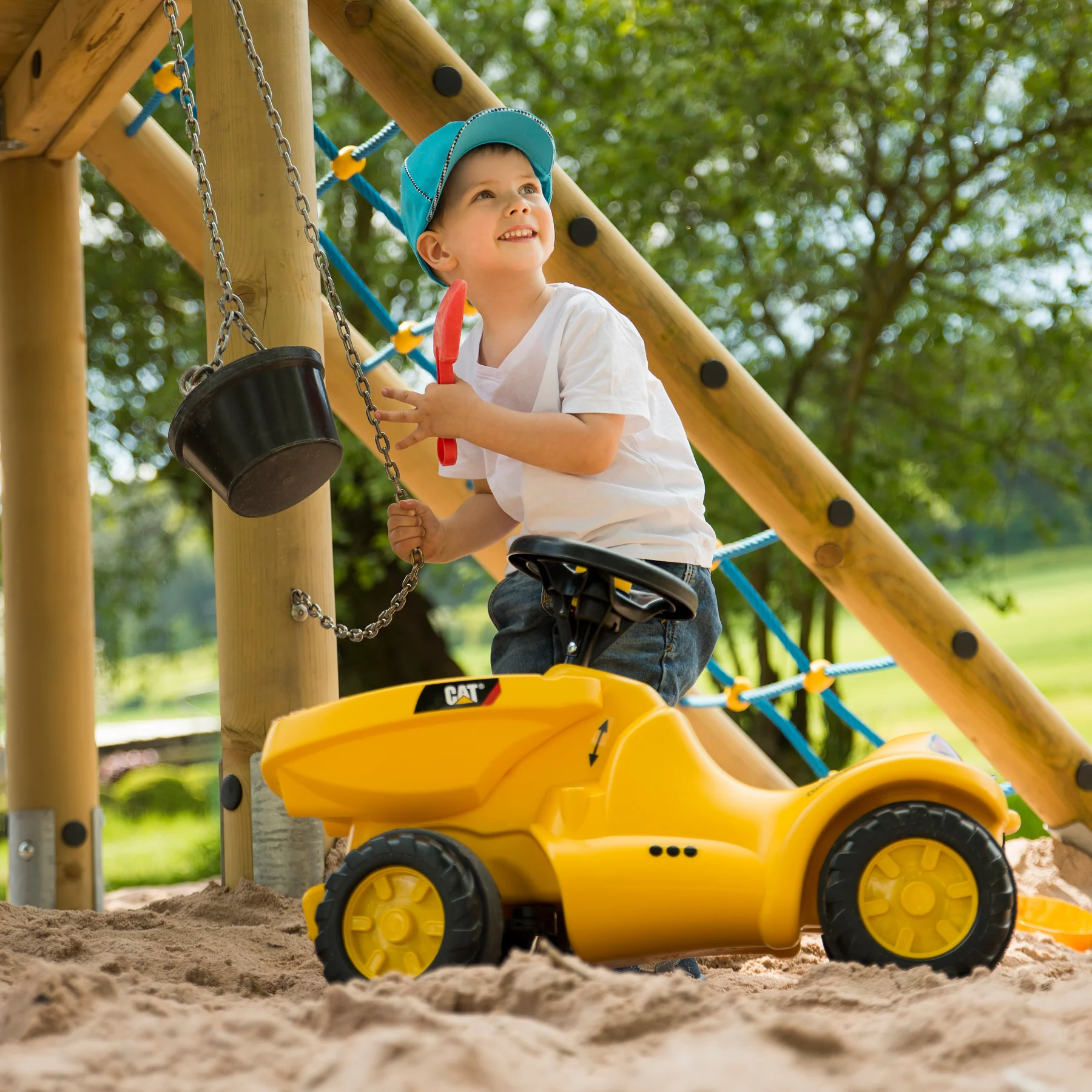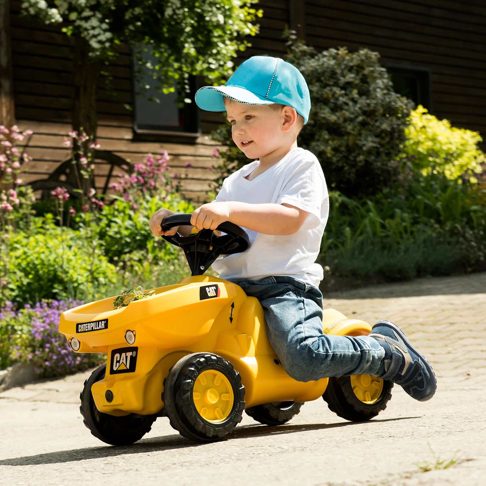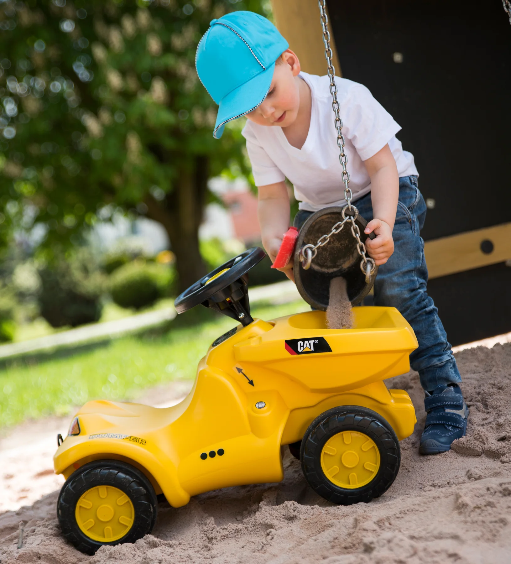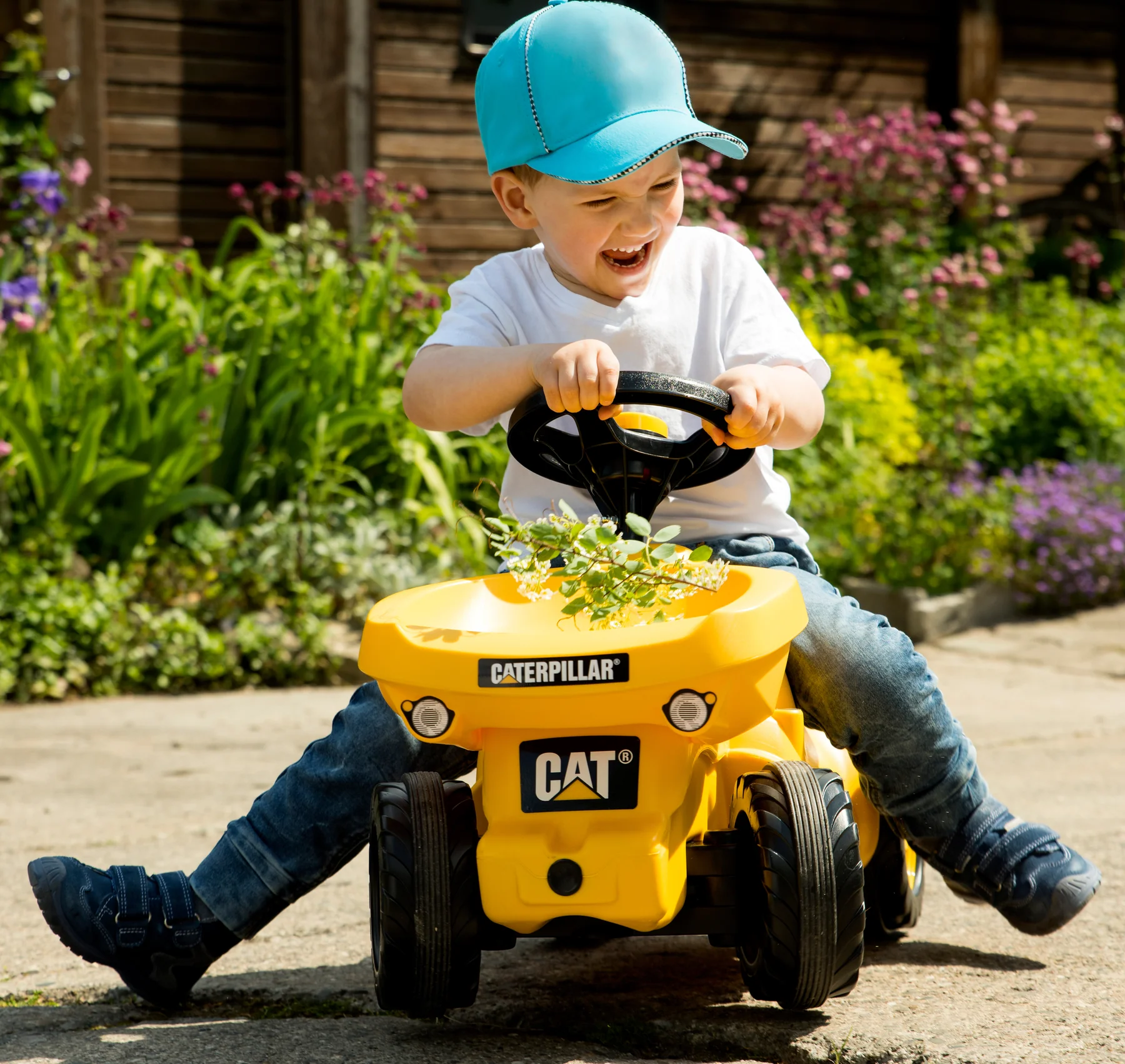 This CAT® Minitrac is suitable for children ages 18 months to 4 years. It comes with an opening hood and squeaky horn for additional play value. It has a built in knee indention allowing the child to scoot around. Tires have an outer band for quieter ride, storage space under hood, stable steering stub axle.