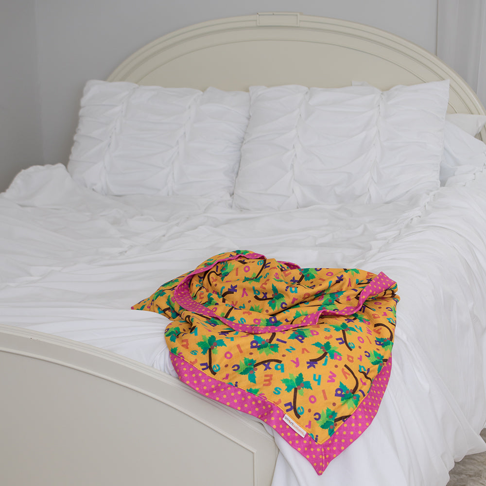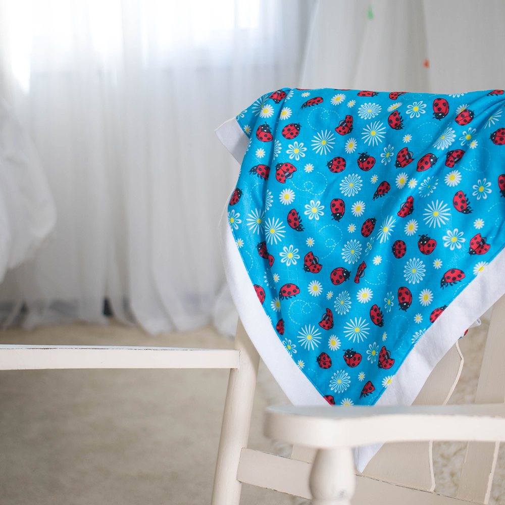 The Smart Bottoms Cuddle Blanket features two sides of printed, quilted organic cotton/ polyester blend fabric. This cozy fabric provides two layers of warmth and weight, with a matching binding that creates a soft, beautiful blanket. The Cuddle Blanket will only get softer with washing, and the print is fade and stain resistant.