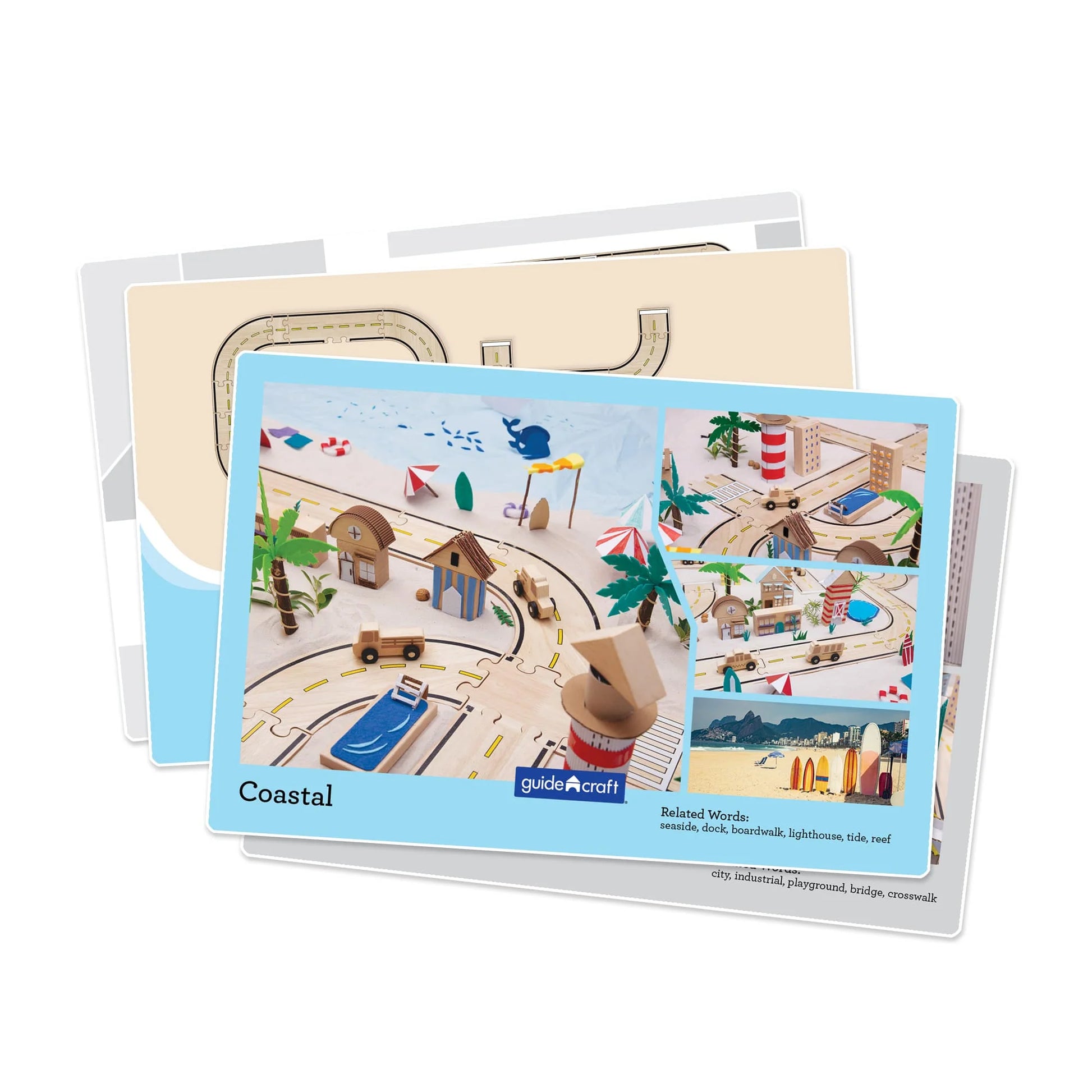 Enhance creative, loose parts play with the Double-Sided Roadway System - 42 pc. set. Children 2 and up can use the varied sizes and shapes to create countless roadway configurations. MDF laminate puzzle pieces now feature screened details on both sides and are scaled to fit with Unit Blocks, increasing dramatic play opportunities. Set features 5 double-sided inspiration cards, providing examples of possible layouts and unique themes, furthering build opportunities. Additional blocks, cards and loose parts not included.