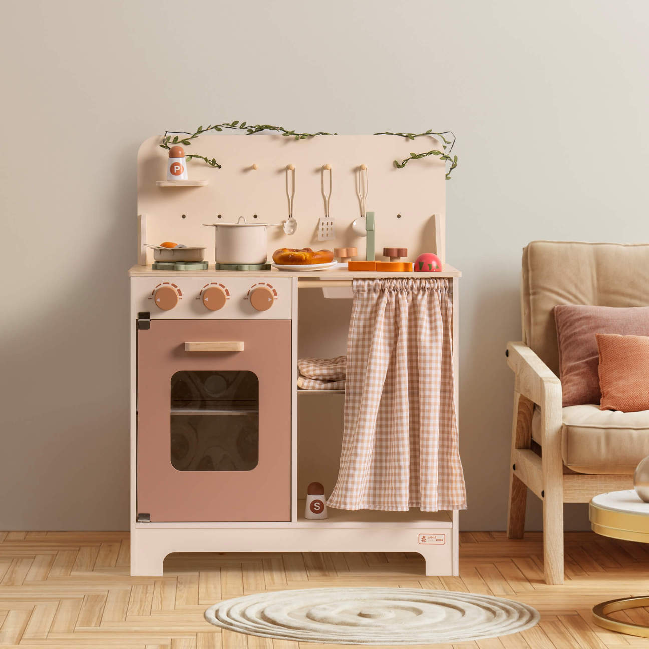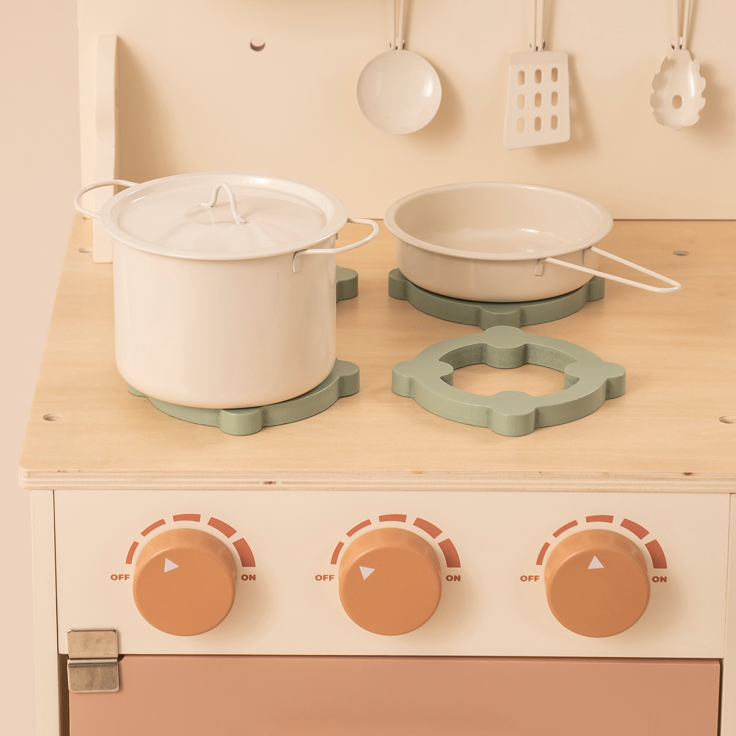 The set comes with a range of accessories including a leaf light string, apron, and gloves, allowing children to create their own unique kitchen style. As well as a play pot and pan and utensils.