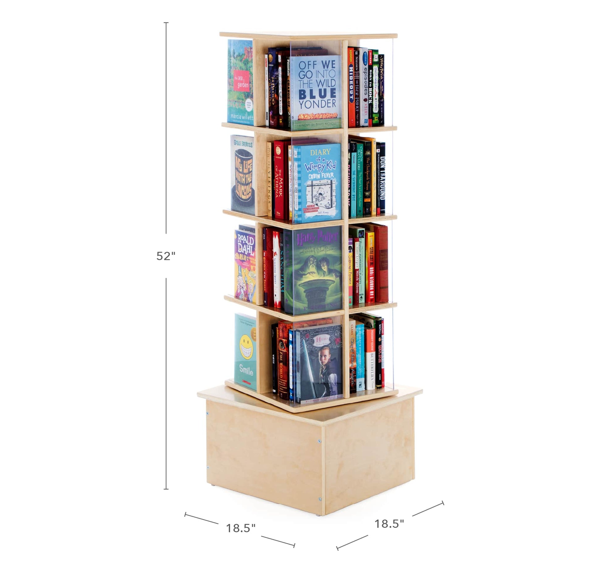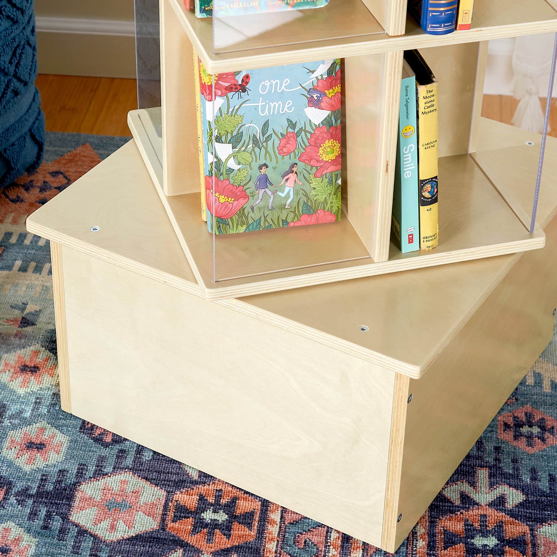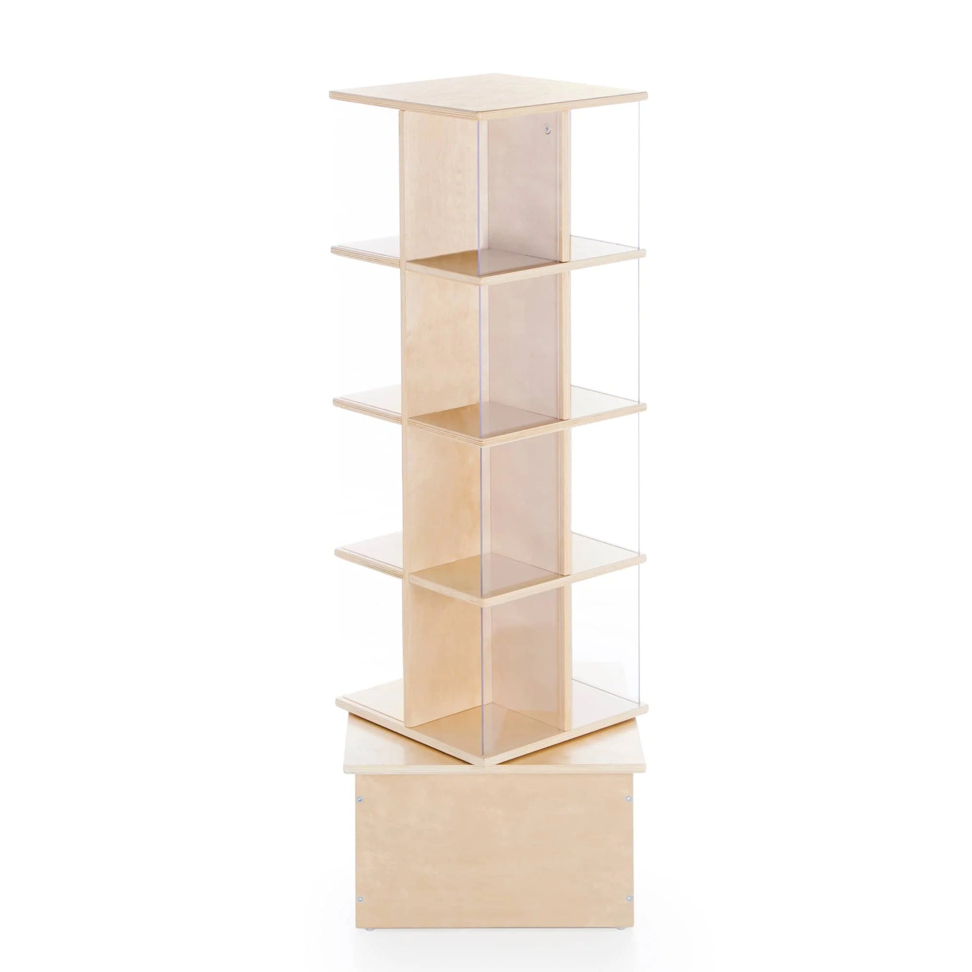 A unique solution for both display and storage, this 5-tiered Floor Standing Spinner Display is the perfect addition in classrooms or libraries. Easily view and access books through clear acrylic sides. Made from durable, easy-to-clean birch plywood with a child-safe UV finish. Assembly required. Measures 18.5"L x 18.5"W x 52"H.
