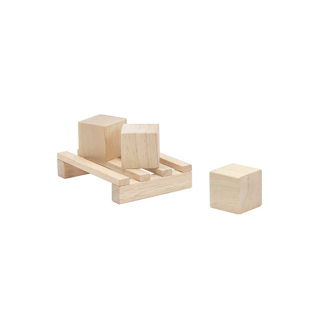 - When the side knob is turned, the pallet fork moves up and down to raise and lower the pallet of wooden cubes