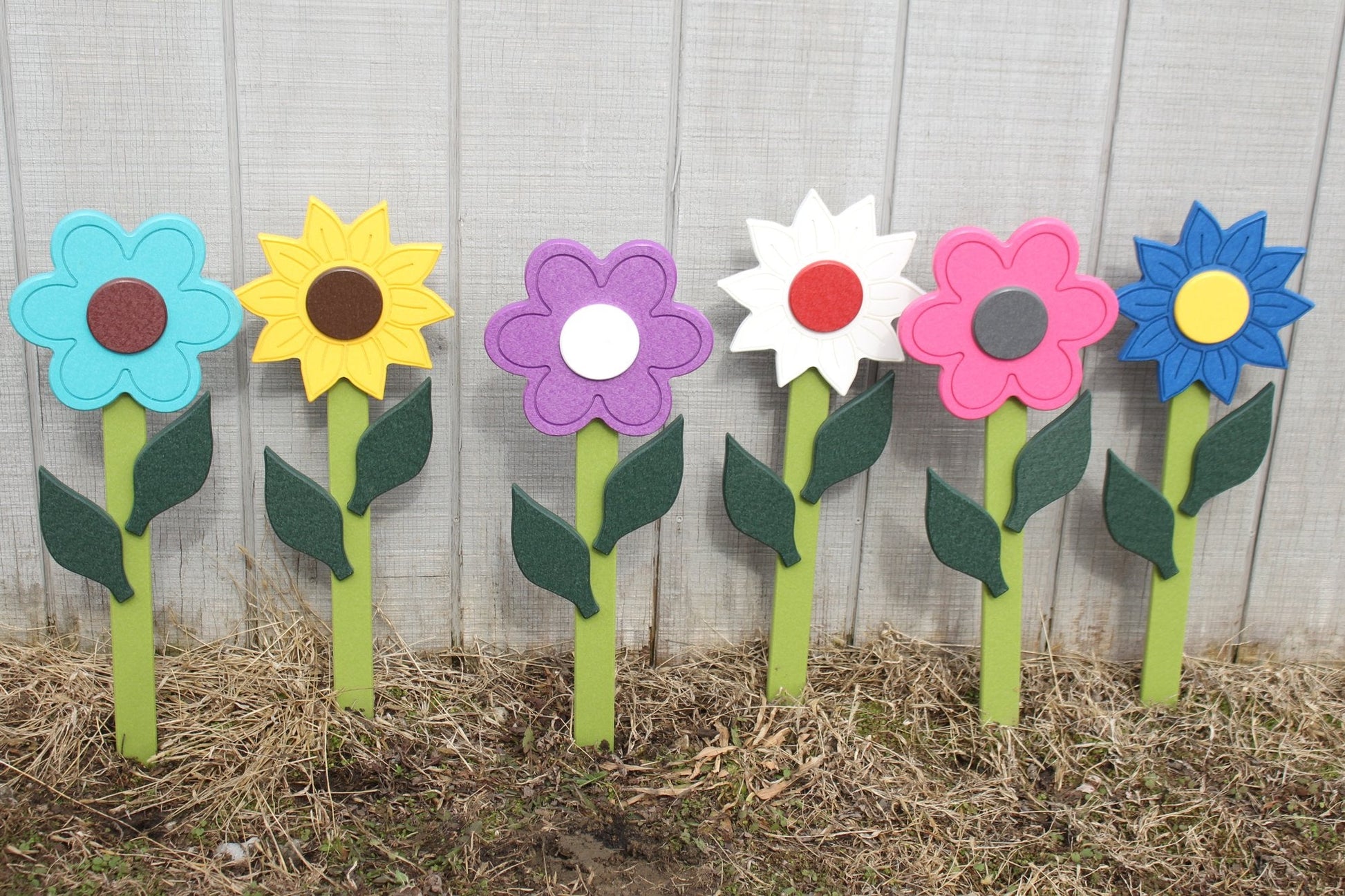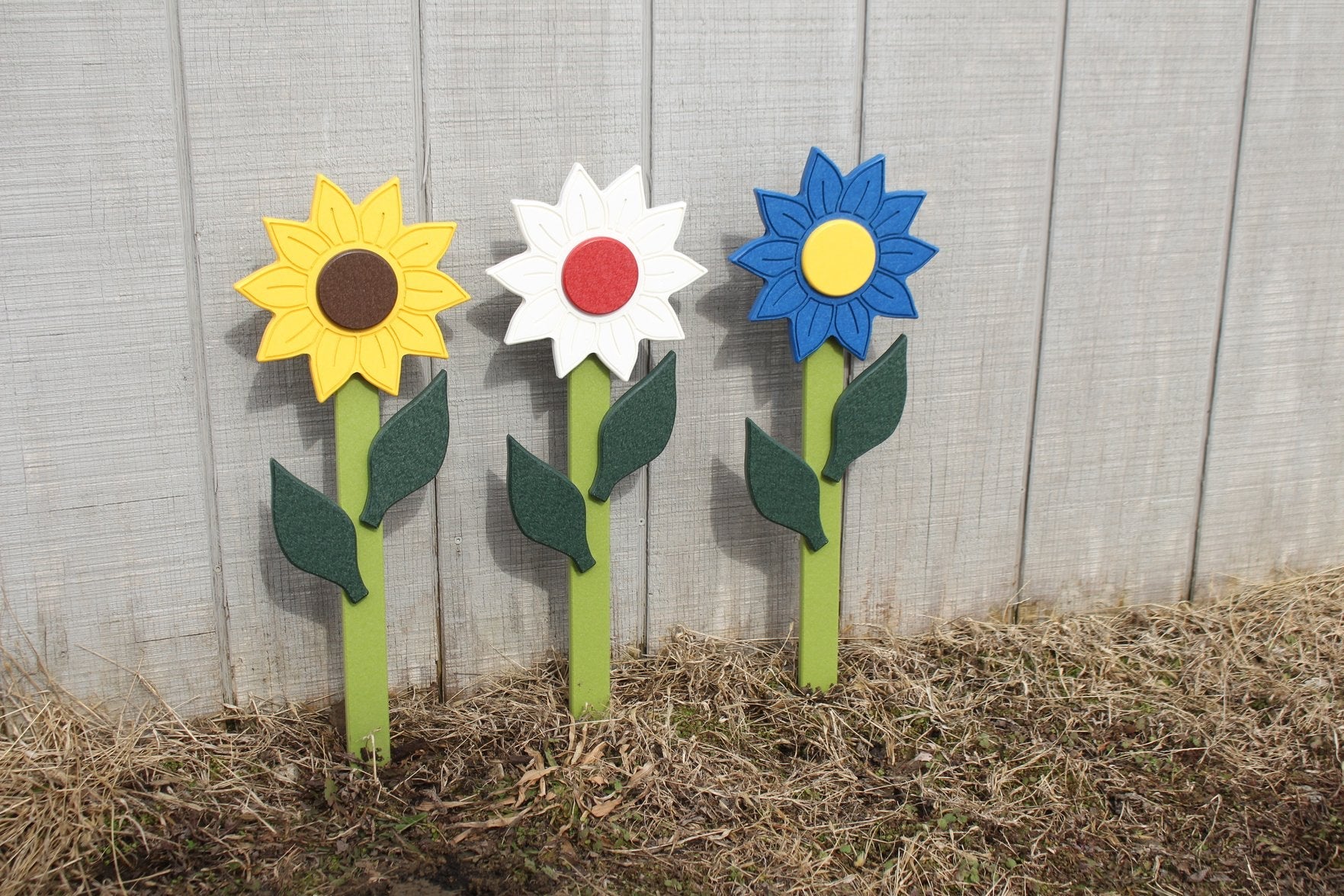 Give your outdoor space a pop of color with these tall, colorful flower stakes. These flowers stay colorful year 'round and won't fade like real flowers do. Each flower (and stem) is made from durable Poly Lumber that will last a lifetime! Flowers ship fully assembled and are ready to stick in the ground right out of the box. Choose between 2 styles, Daisy or Sunflower, and 3 unique color combinations of each style. Each flower measures approximately 23" tall x 8" wide x 1" thick.