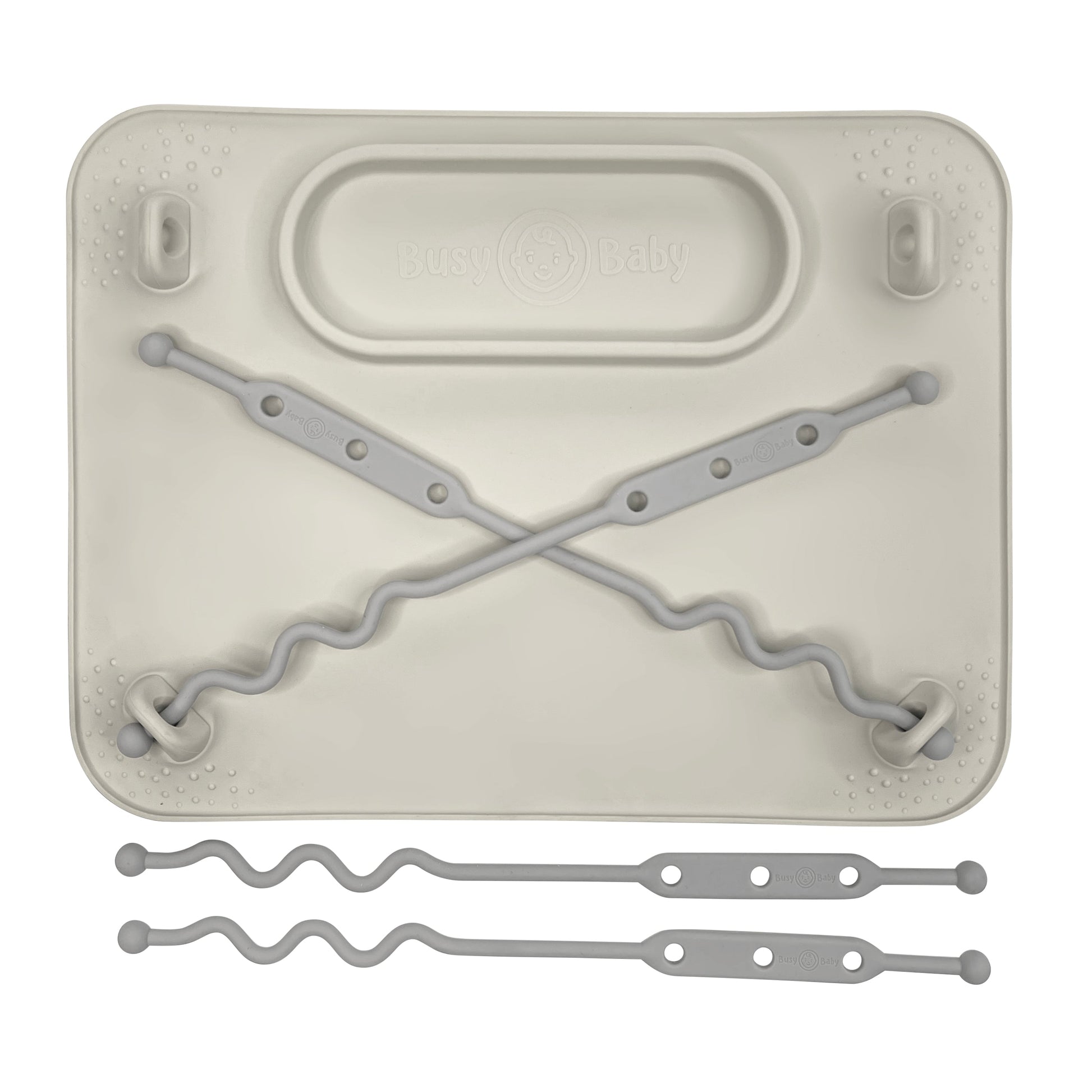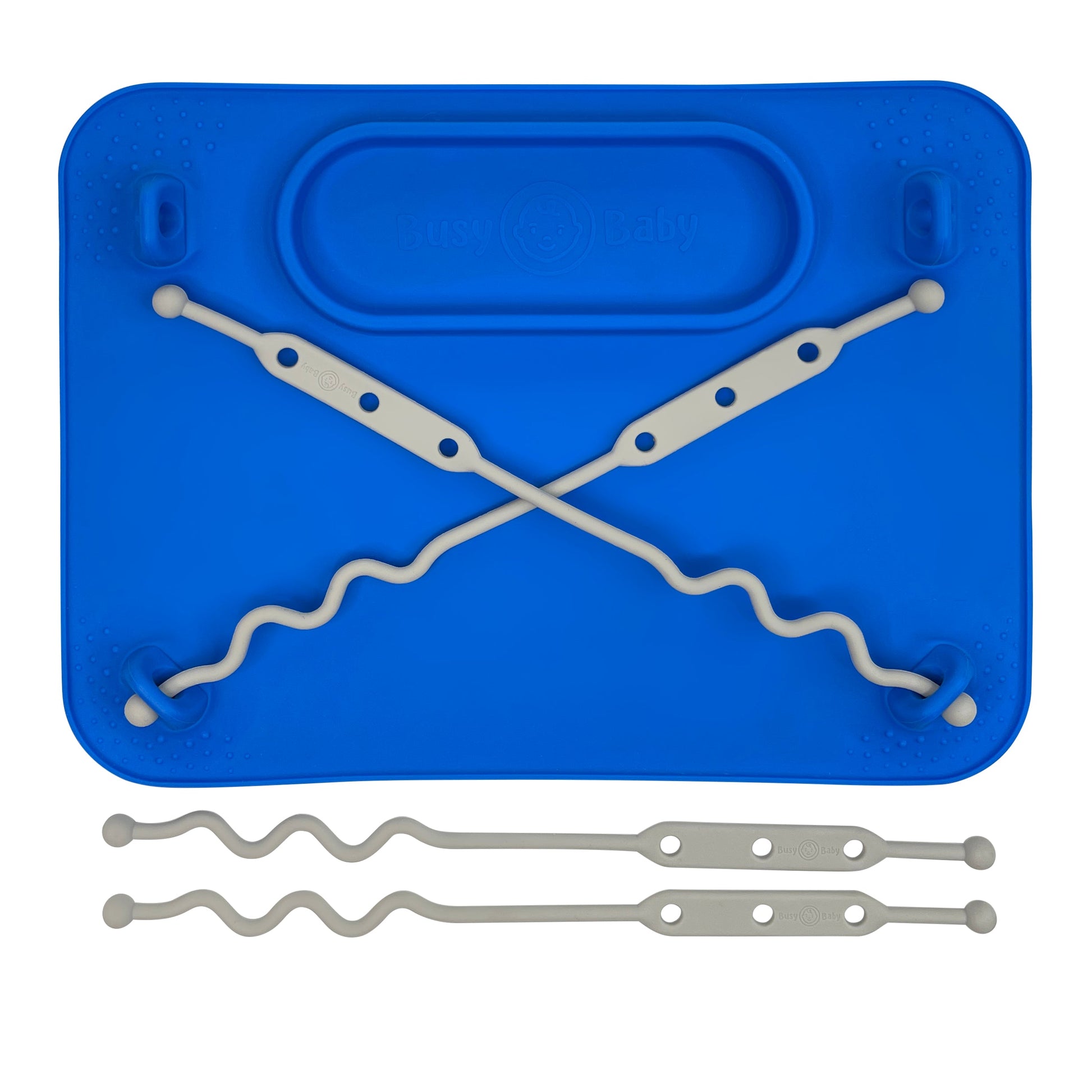 Say hello to your new favorite mealtime accessory! The Busy Baby Mat is the first-ever silicone placemat to include suction cups to keep the mat in place on smooth surfaces AND 4 tethers (toy straps) to keep utensils, toys, and teethers within reach and off the floor! Use it at home or on-the-go with the convenient wet bag.