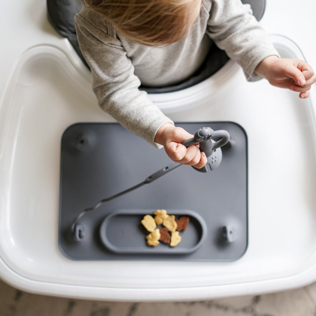 A mom-invented silicone suction placemat designed to keep your baby's favorite toys, teethers, and utensils within reach and off the floor! *Will not work with Lalo or Stokke Tripp Trapp high chairs.