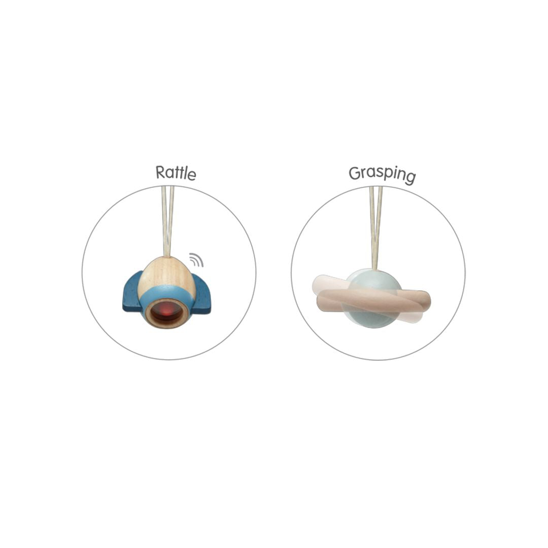 - Comes with a rocket and planet toy that is detachable from the top support