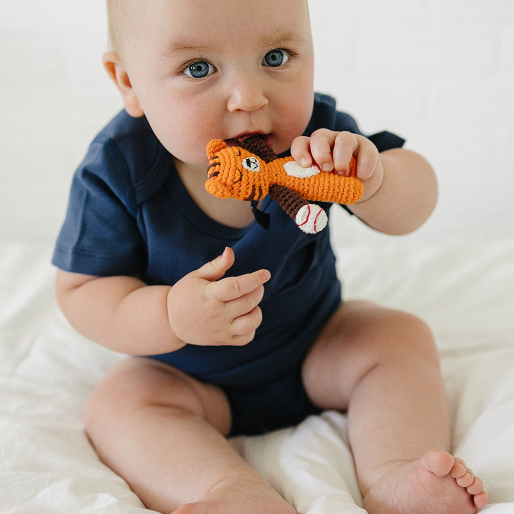 Meet our playful crochet friend, Tiger, heading out for a game of baseball. Hand-knitted with premium 100% cotton yarn, this Pocket Pal meets or exceeds all US safety standards. With a snap button on its back, it easily attaches to any Our Little Treasures apparel, making it the perfect companion for all your little one's adventures.