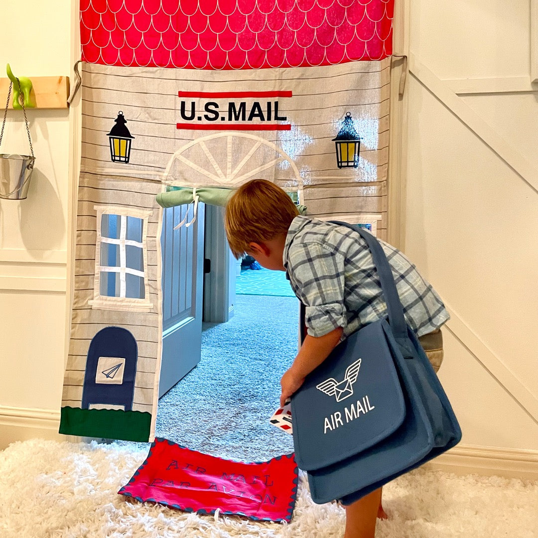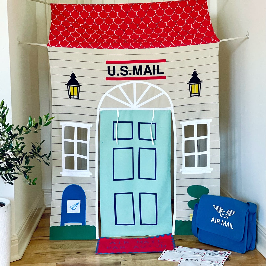 Are they ready to deliver some letters? The child-size mail bag and its contents will assist your mail carrier-in-training as they make their deliveries. Your postal worker can receive letters to deliver through a mailbox in any indoor location. Yes, temporarily. The quick-to-assemble doorway play tent can be taken down with ease when using your favorite damage-free hanging adhesive hooks. The Post Office Set is hand sewn and silk-screened.
