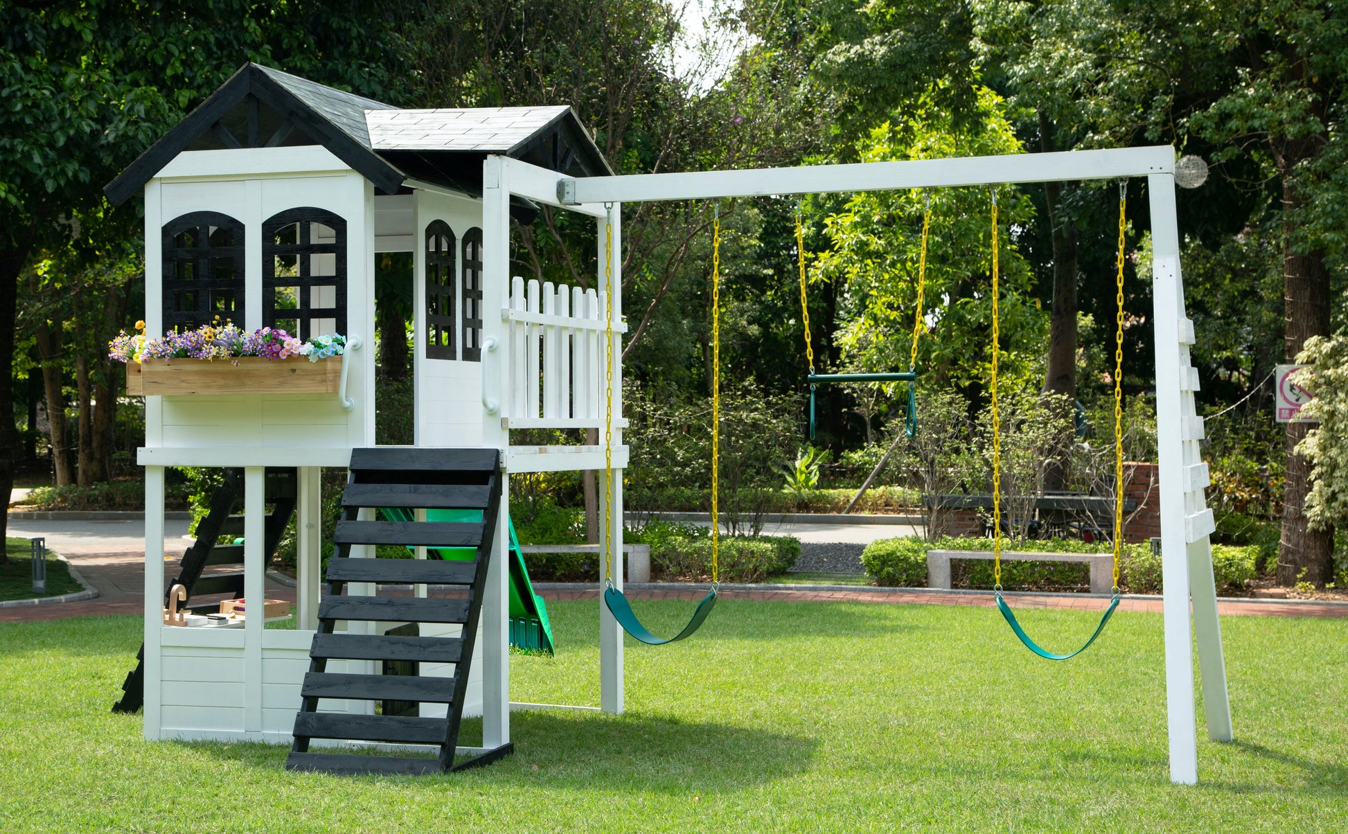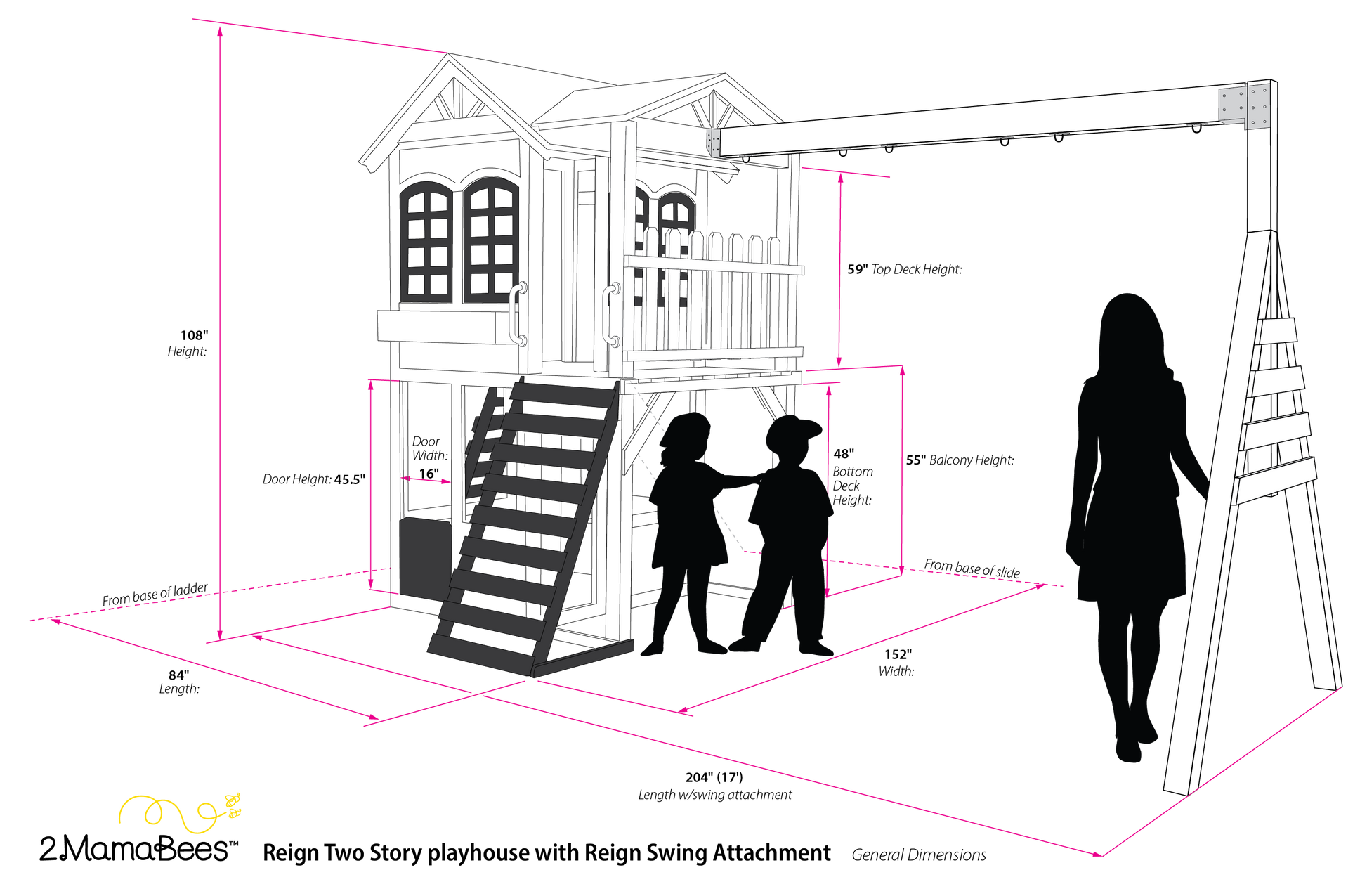 2MamaBees Reign Two Story Playhouse will create hours of sensory play while also helping your little one explore the world of imagination. The beautiful black and white farmhouse design will create a stunning addition to any backyard. The Reign Two Story Playhouse includes a built-in kitchen, beautiful wooden play food and cedar window boxes to create your own potted garden. Swing Attachment is sold separately.