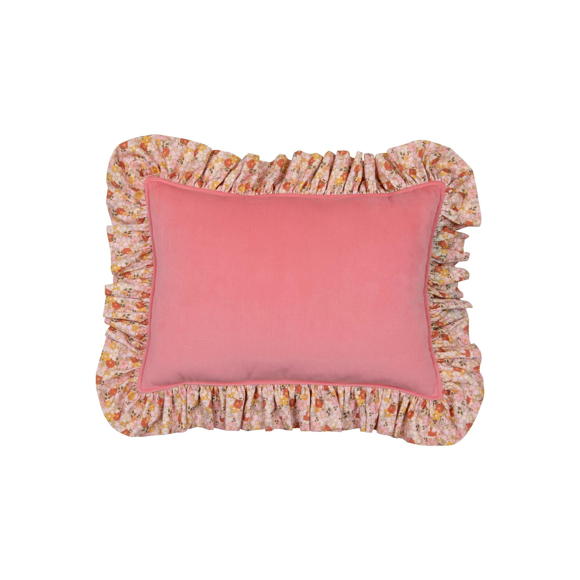 This soft-to-touch pillow, with a fancy frill, is carefully sewn from high-quality floral satin cotton and soft pink velvet fabric.