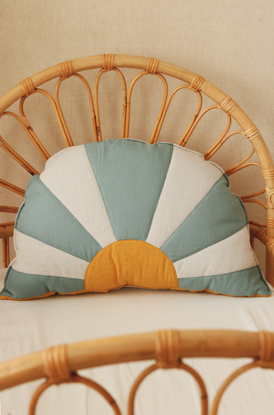 This patchwork blue and yellow sun-shaped cushion is carefully made of high-quality cotton and linen.