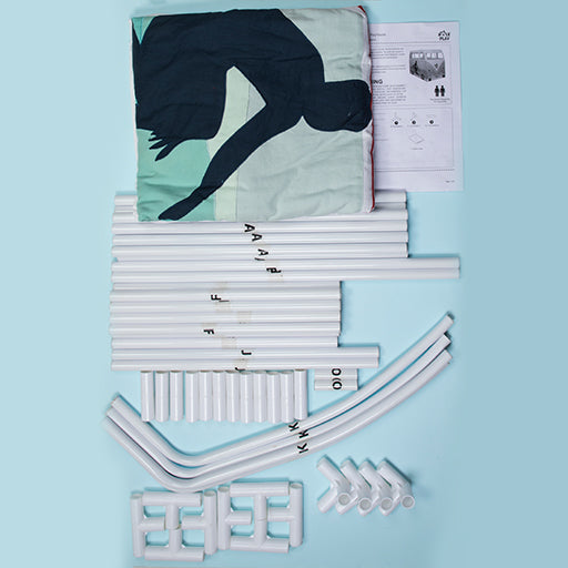 Our Surfing Camper is made of 100% Cotton canvas. Its fabric shell snugly fits on a metal frame creating a piece akin to a piece of furniture. Children will enjoy hours of fun indoors and outdoors going on an imaginary surfing vacation right in the comfort of your home.