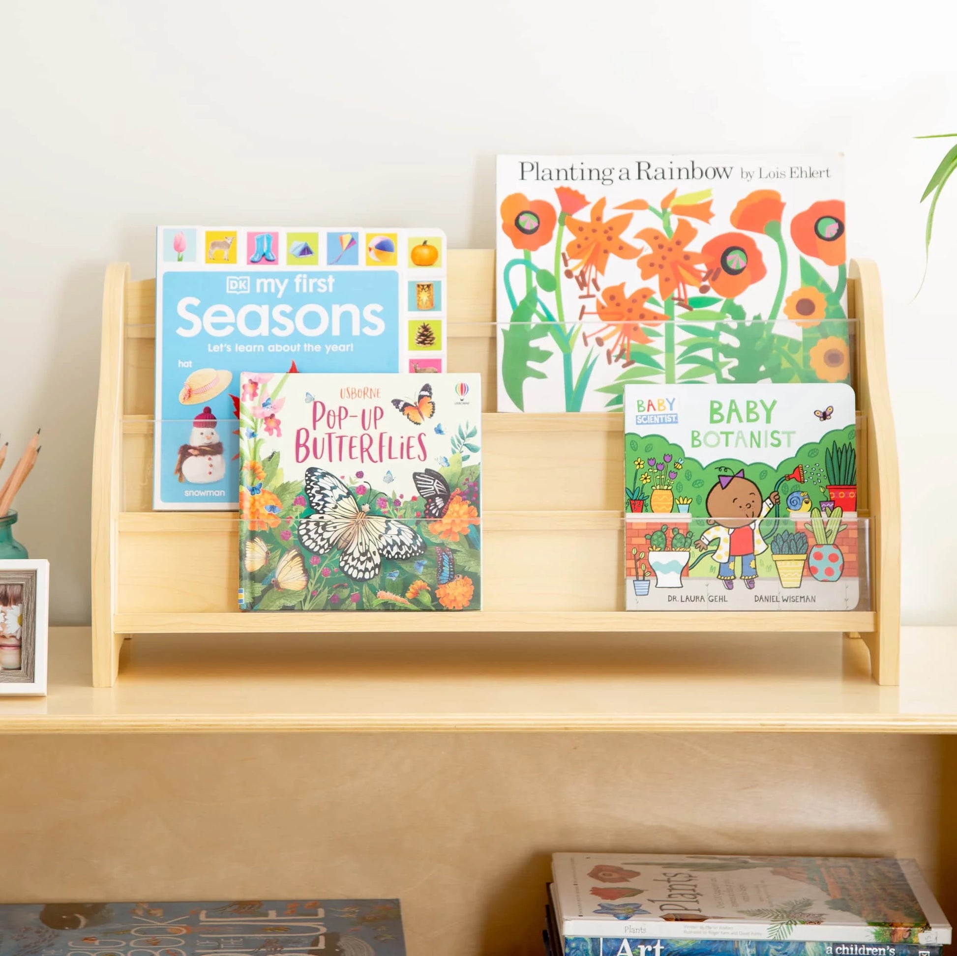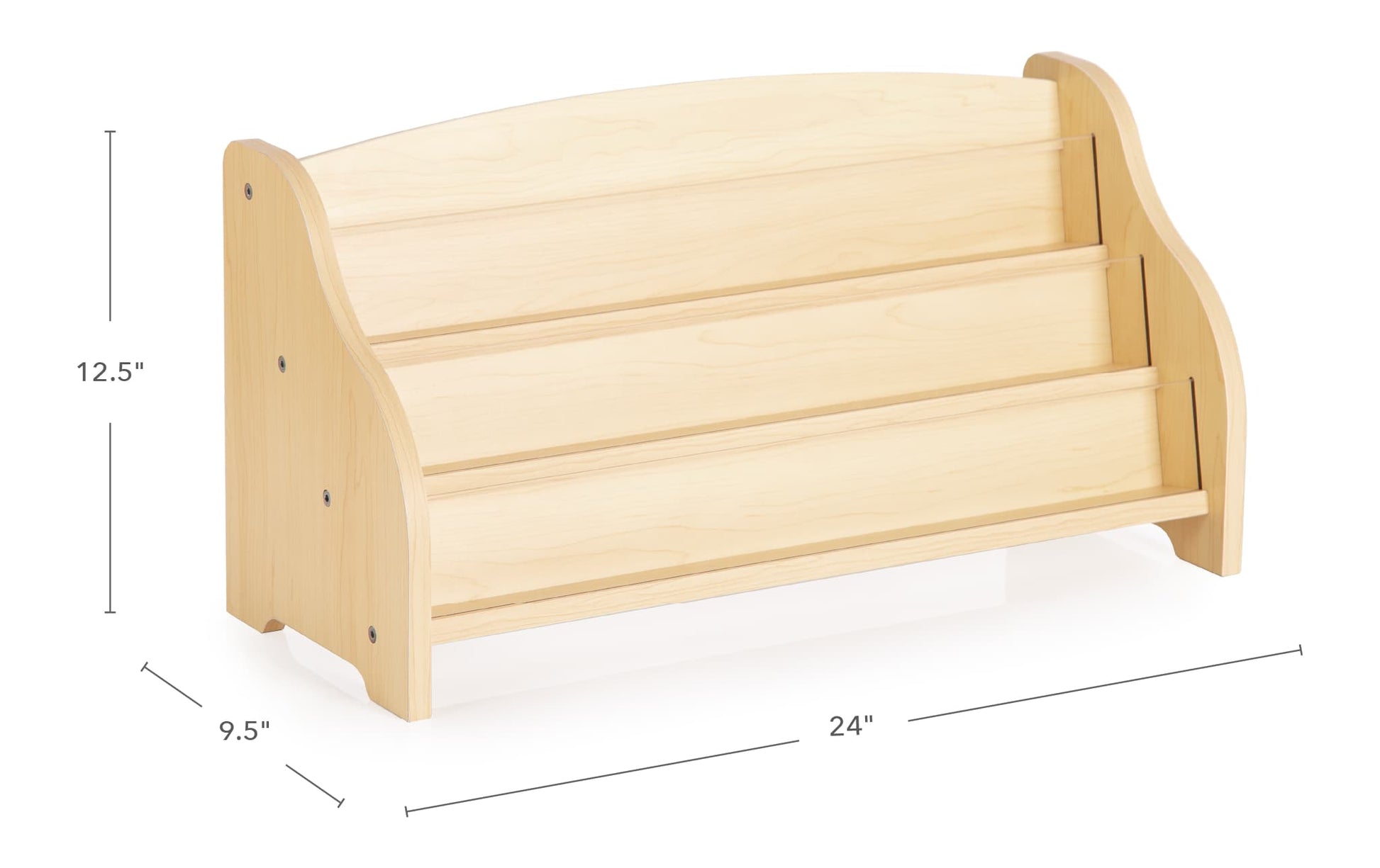 Children can easily view and access their favorite books using this practical and versatile Tabletop Book Display. Tiered shelves featuring clear acrylic dividers provide plenty of accessible space to store and display books in children's bedrooms, playrooms or classroom settings. Made from durable maple MDF, this space-saving storage unit is easy to clean. Assembly required. Measures 24"W x 9.5"D x 12.5"H