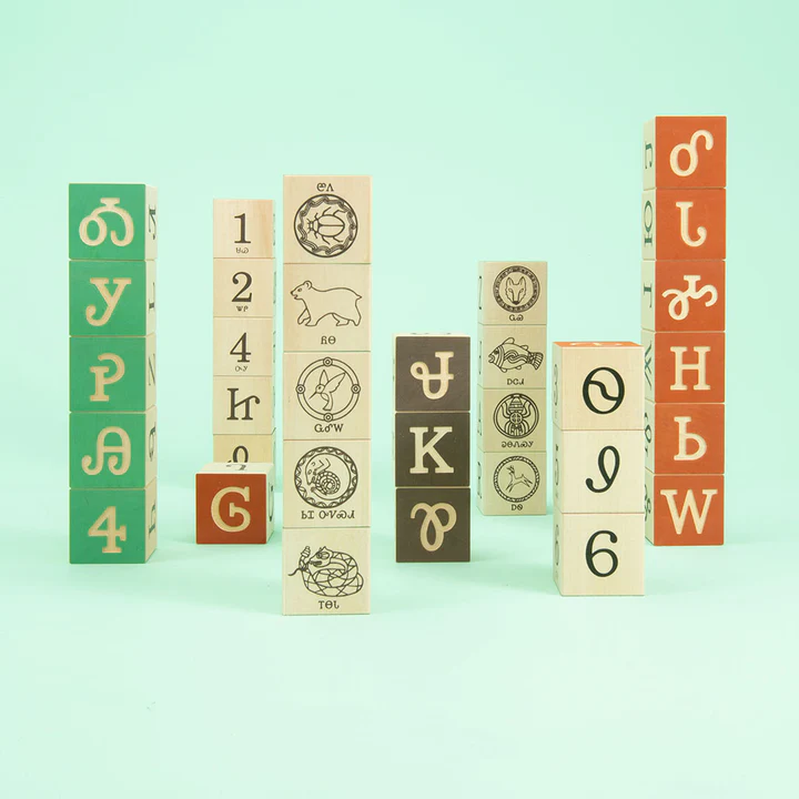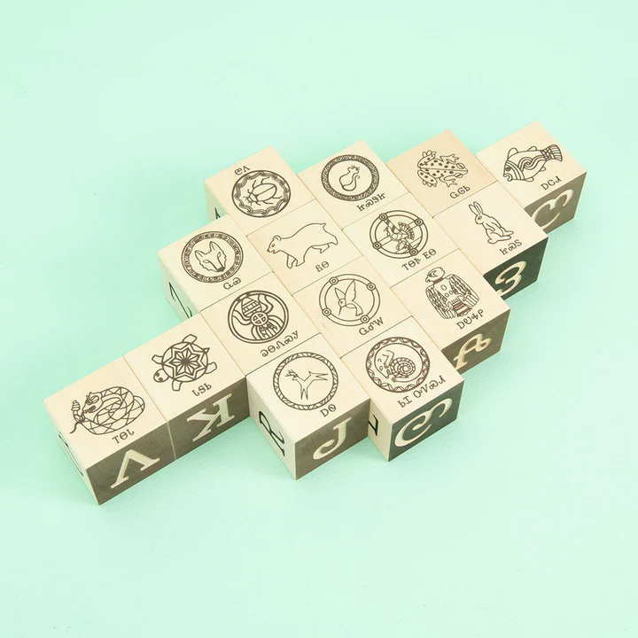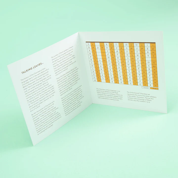 Explore 85 individual Cherokee characters debossed and printed with animal images and numbers. Teach the entire Cherokee syllabary as developed by Cherokee silversmith Sequoyah in 1821.