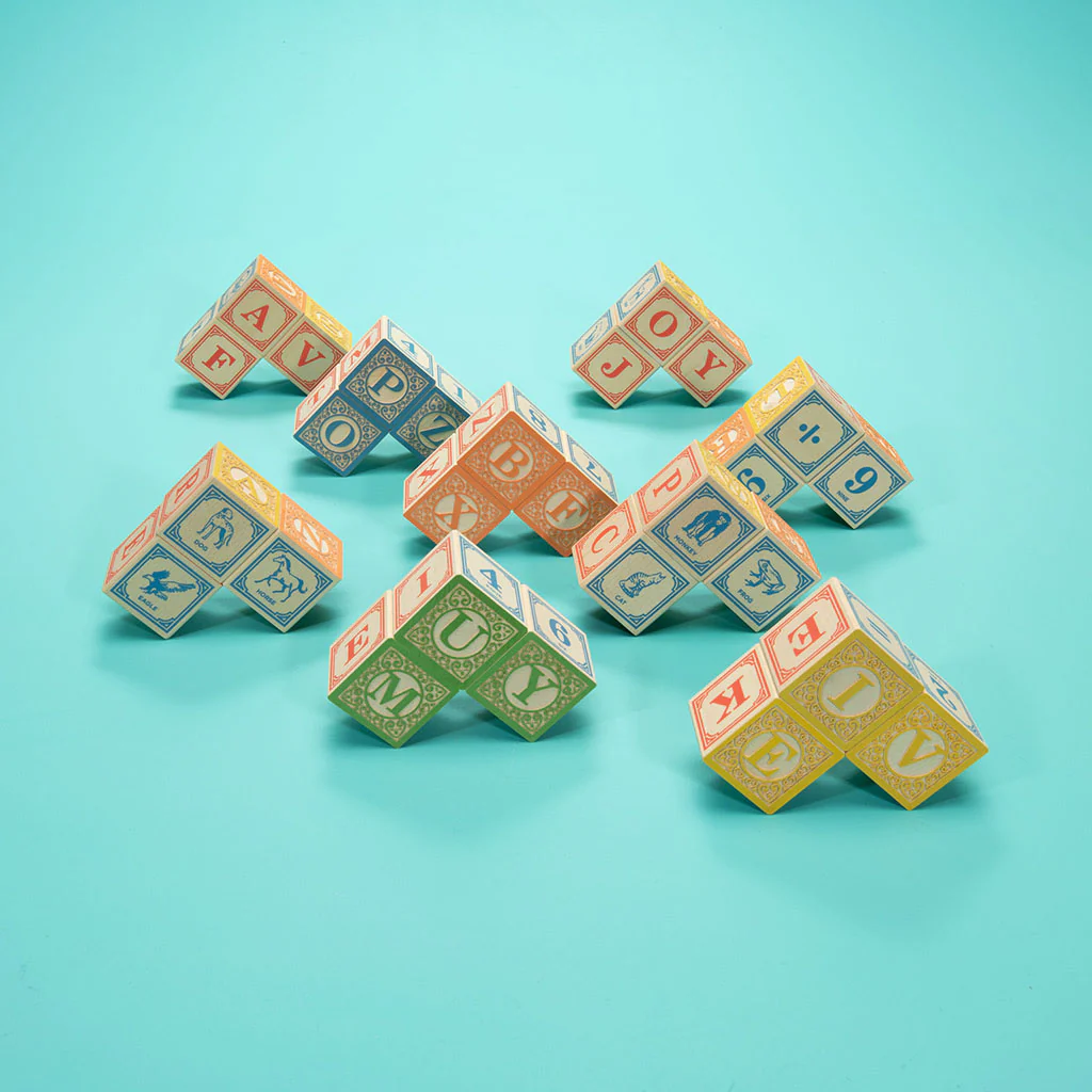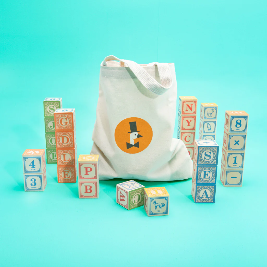 Inside the bag, find 28 classic ABC blocks featuring four full alphabets. Add colorful numbers, math symbols, and a menagerie of hand-crafted animals.