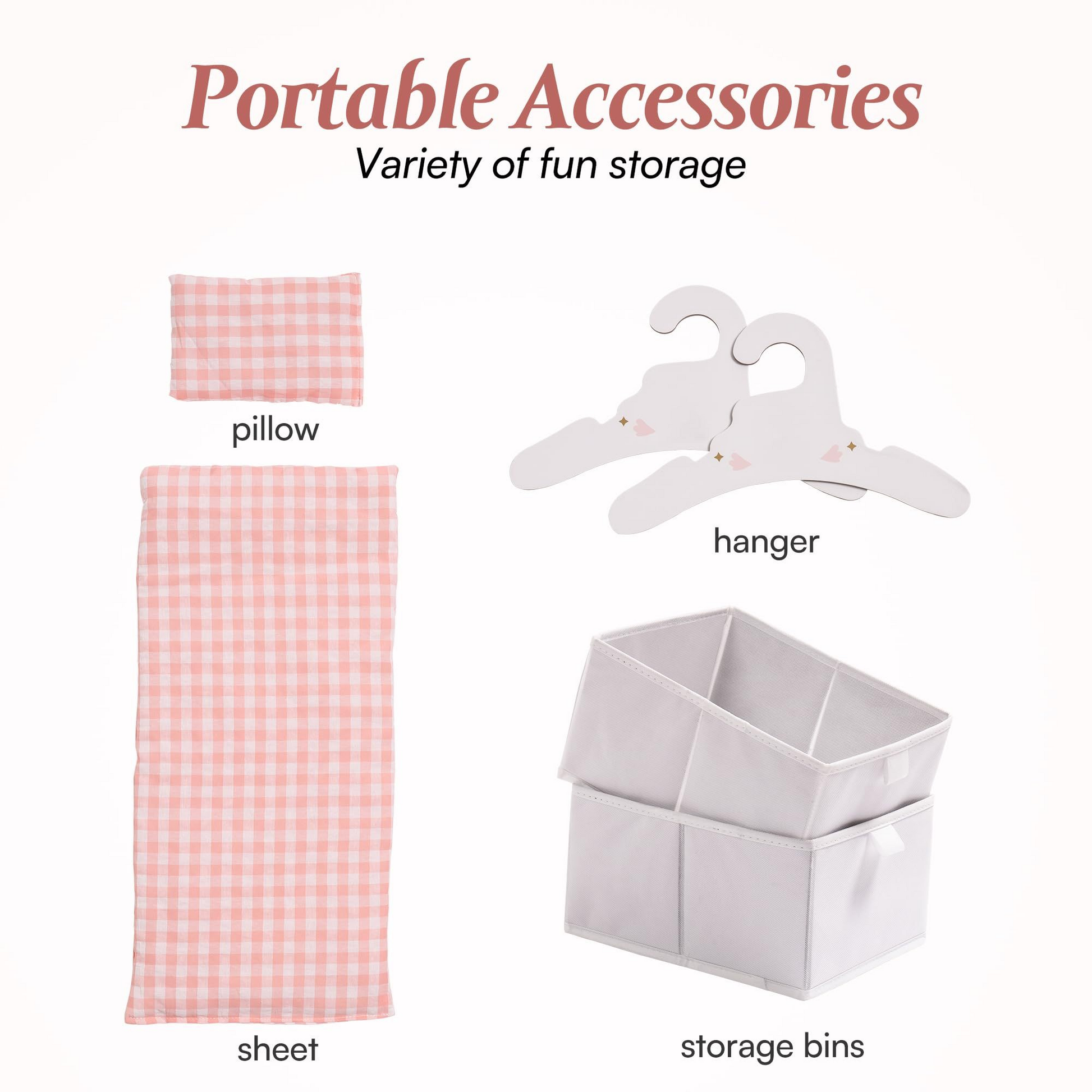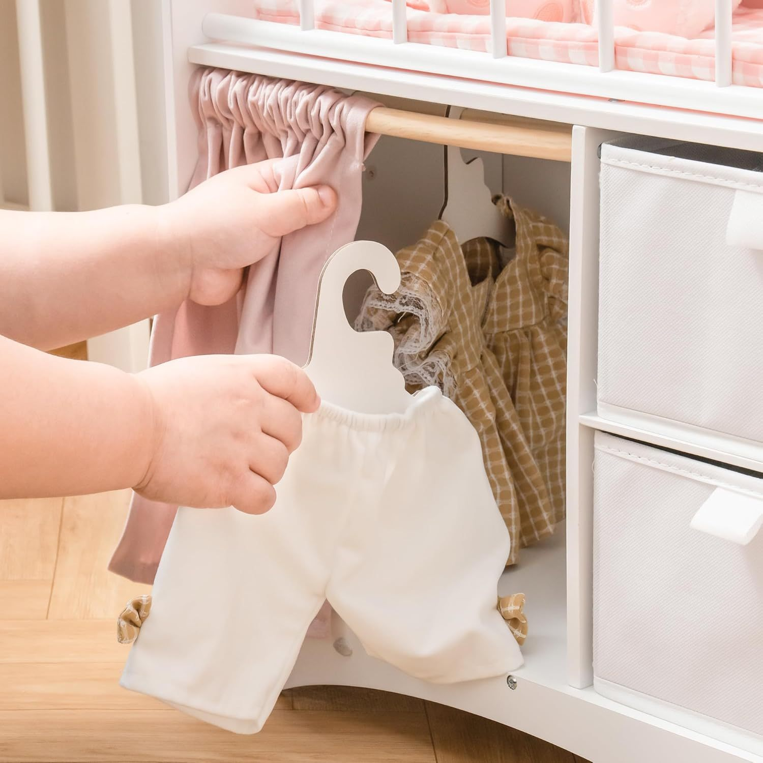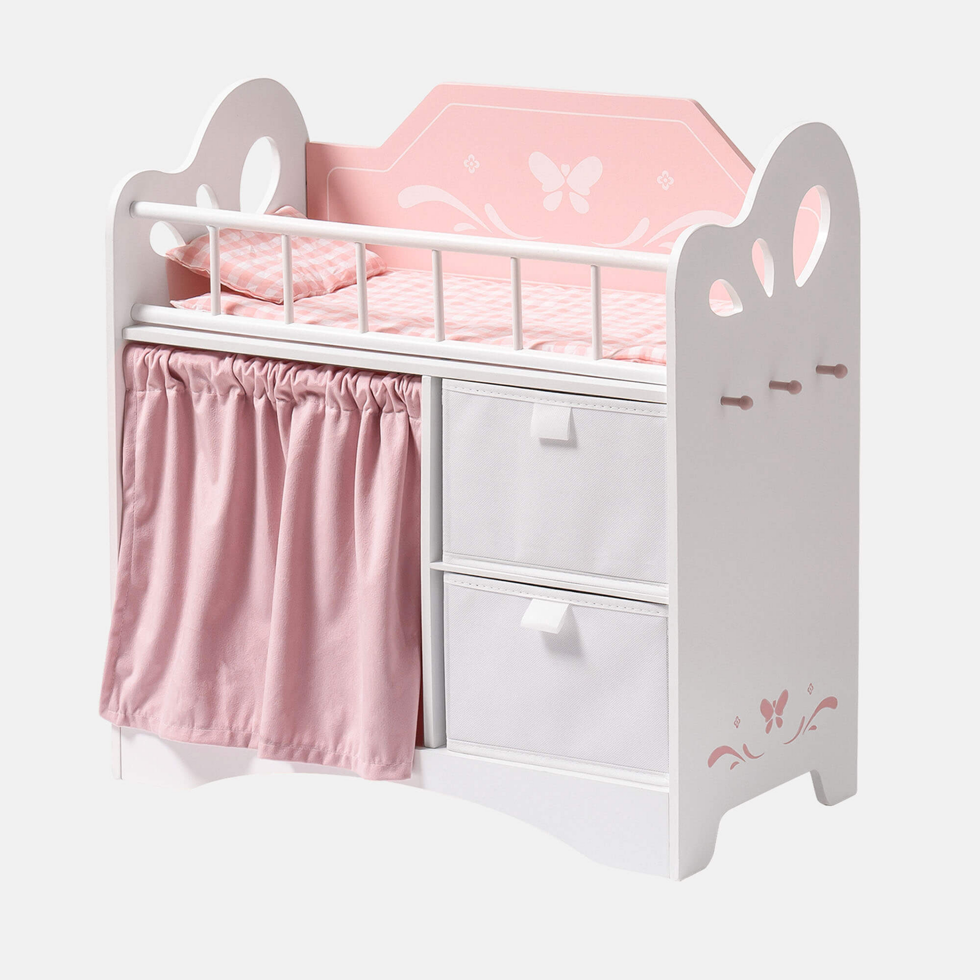 This baby doll bed combines a doll bed, doll changing table and storage in one! Our doll crib has multiple areas for doll clothes, toys, and pretend baby toiletries. Our baby crib toy has larger storage space like a real wardrobe, teaching children how to organize clothes. As well as 2 baskets and 3 wooden hooks to store doll clothes, accessories, and other essentials more easily.