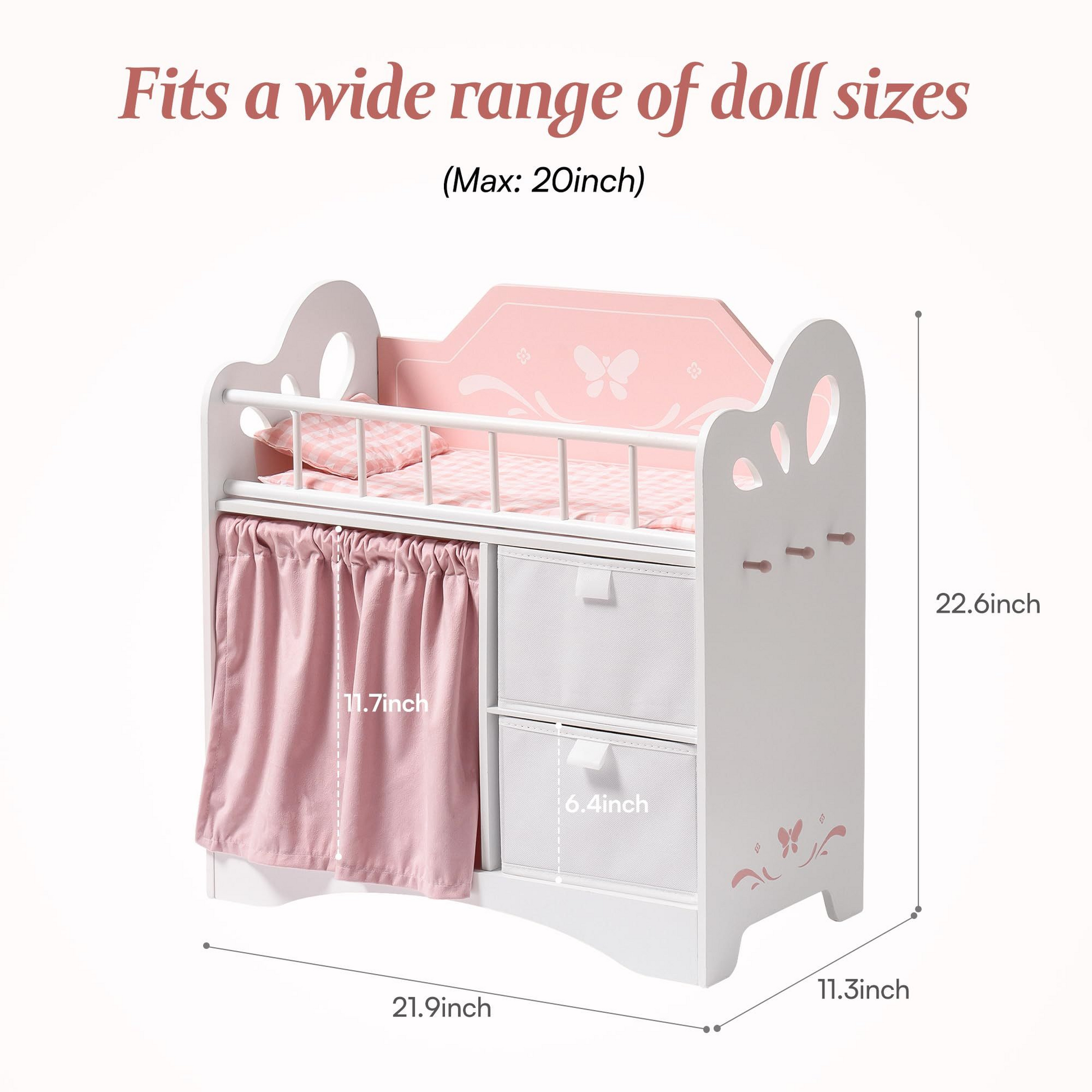 The baby doll bed size is measuring 21.9 x 11.3 x 22.6 inches, which is suitable for most dolls up to 20 Inches. The doll furniture is complete with cotton pillow, sheet, and quilt, so your doll will sleep comfortably under the cozy quilt.