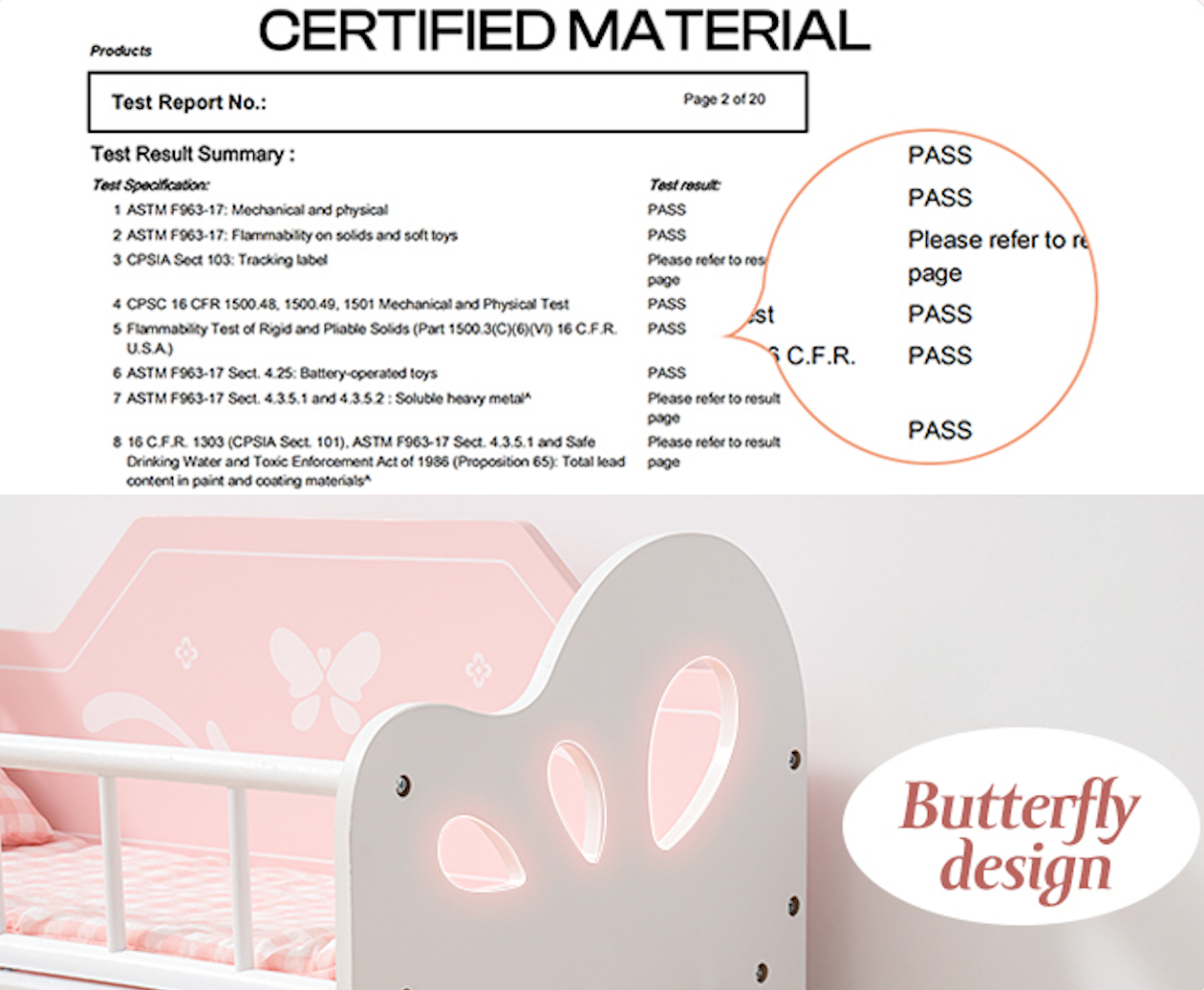 Our baby doll crib is made of natural wood material, non-toxic, odorless and won't affect health. This doll crib is color-coordinated with a classic color scheme complimenting any room.